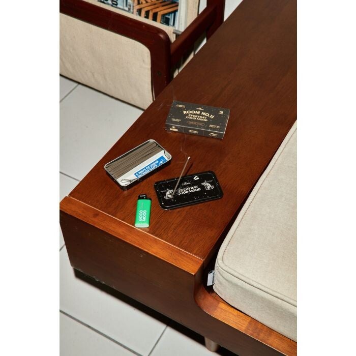 Scatolina decorata in metallo. Contenuto: 70 bastoncini di incenso lunghi 9,4 cm con un'autonomia di 15-20 minuti ciascuno, due clip che fanno da supporto ai bastoncini, un foglietto illustrativo. Il coperchio della scatola può essere utilizzato come vassoio per raccogliere la cenere. Dimensioni scatola: 10,49 x 6,3 x 1,8 cm.