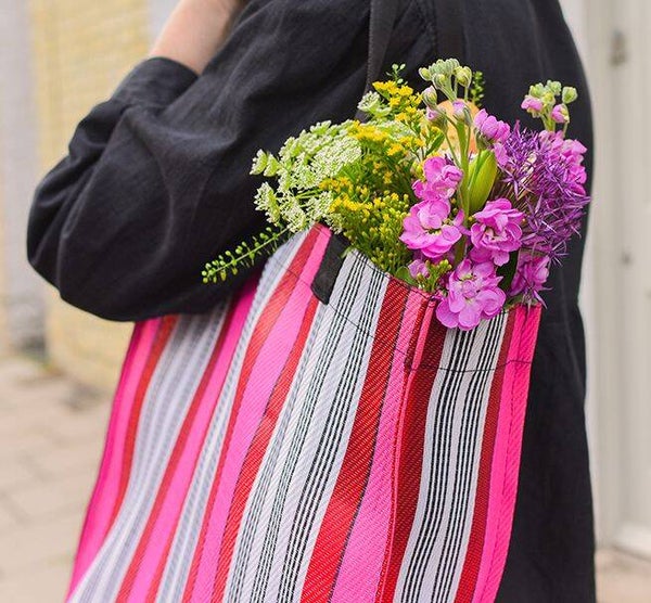 Shopper intrecciata e creata con tessuti ricavati dai sacchi di cemento usati, una borsa ecologia tanto elegante quanto pratica. I sacchi di cemento vuoti provenienti dal settore edile vengono raccolti, lavati e triturati. Il materiale ricavato viene poi filato, tinto nuovamente e tessuto in queste meravigliose borse!