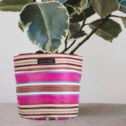 Copri vaso intrecciato e creato con tessuti ricavati dai sacchi di cemento usati, un contenitore dai diversi utilizzi. I sacchi di cemento vuoti provenienti dal settore edile vengono raccolti, lavati e triturati. Il materiale ricavato viene poi filato, tinto nuovamente e tessuto in questi meravigliosi !